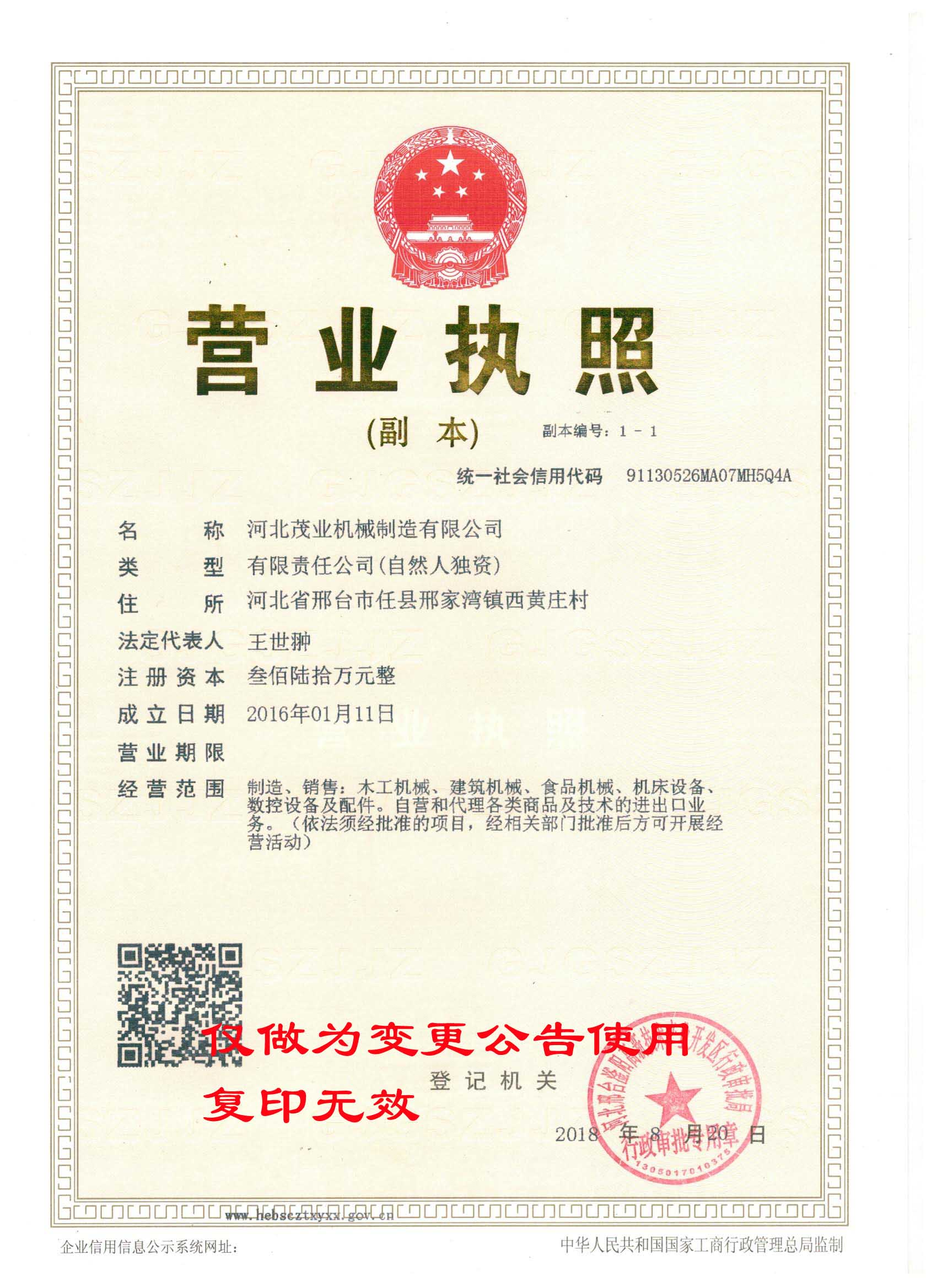 我司邢臺(tái)茂業(yè)機(jī)械制造有限公司,因公司業(yè)務(wù)發(fā)展的需要,現(xiàn)已整體變更為河北茂業(yè)機(jī)械制造有限公司,并于2018年8月20日取得河北邢臺(tái)滏陽(yáng)高新技術(shù)產(chǎn)業(yè)開發(fā)區(qū)審批局頒發(fā)的營(yíng)業(yè)執(zhí)照?,F(xiàn)將有關(guān)事項(xiàng)公告如下: